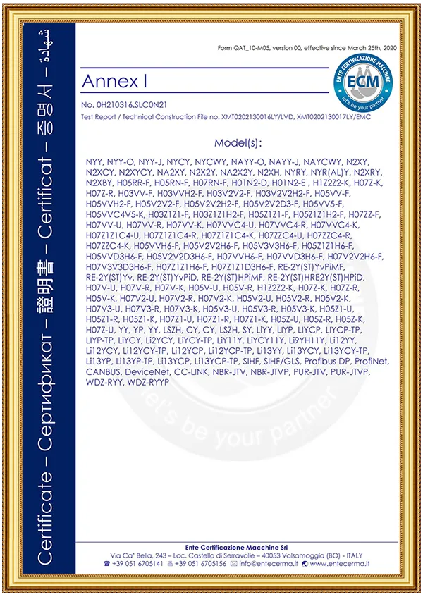 این شرکت مجهز به تجهیزات تولید و آزمایش پیشرفته است و فرآیندهای تولید استاندارد شده بین المللی را اجرا می کند. محصولات این شرکت دارای گواهینامه های معتبری مانند China CCC، اتحادیه اروپا CE، UL آمریکای شمالی و CUL هستند و سیستم مدیریت مطابق با استاندارد ISO9001 است. هشت خط تولید اصلی که در حال حاضر تشکیل شدهاند - کابلهای برق، کابلهای داده، کابلهای انعطافپذیر ربات، کابلهای تخت، کابلهای قرقره، کابلهای هالوژن کم دود، کابلهای خودروهای انرژی جدید و کابلهای سفارشی ویژه - همگی مطابق با الزامات فنی جهانی توسعه یافتهاند و به طور کامل نیازهای صحنه صنعتی مناطق مختلف را پوشش میدهند.
